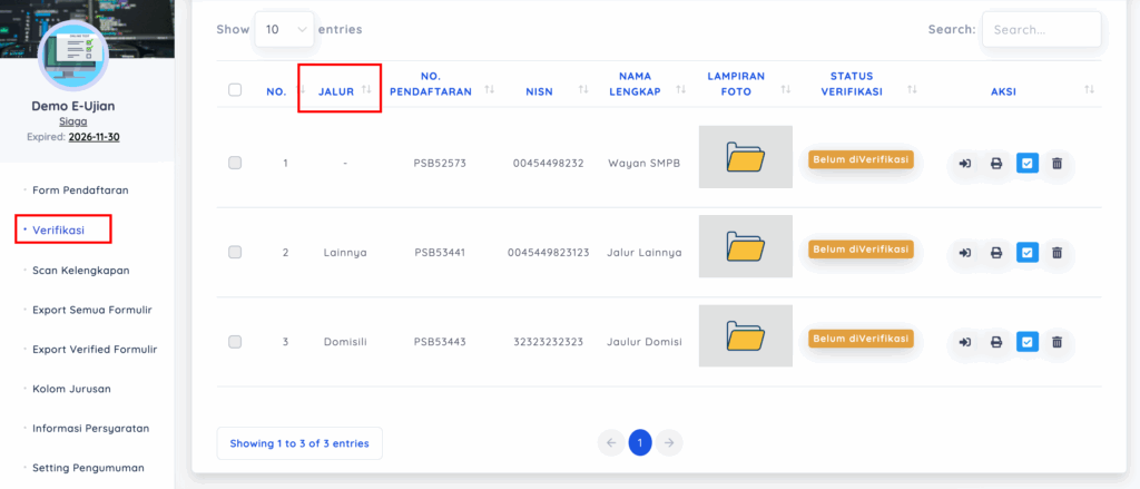Admin/Guru dapat dengan mudah melakukan filter jalur penerimaan yang dipilih oleh calon siswa melalui menu Verifikasi dan kemudian klik kolom Jalur seperti berikut
