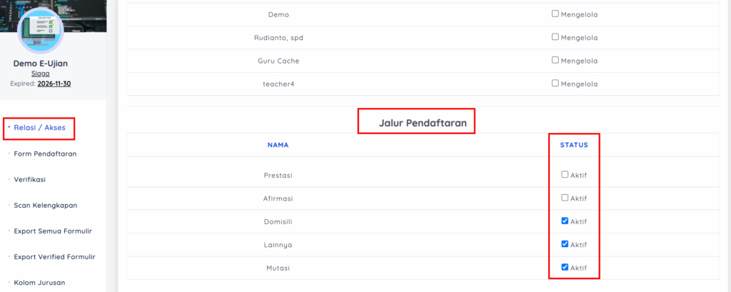 Untuk mengaktifkan multi jalur penerimaan SPMB, dari Admin, silakan pilih menu PPDB -> Relasi/Akses dan kemudian pilih Jalur Pendaftaran
