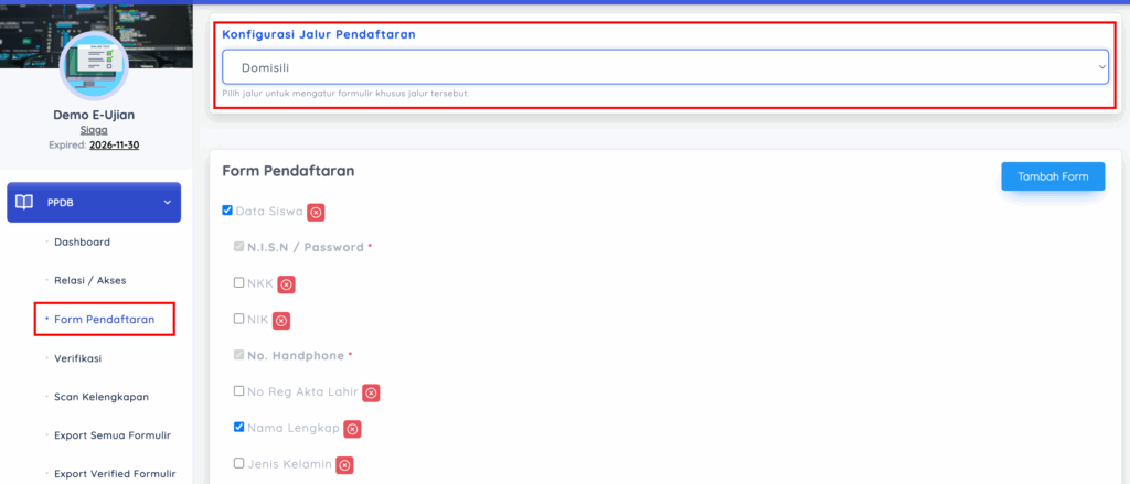 Admin/Guru yang memiliki akses SPMB (Baca Cara Memberikan Akses Menu/Fitur Tertentu ke Guru) dapat menyesuaikan form masing-masing jalur penerimaan melalui menu PPDB -> Form Pendaftaran > Konfigurasi Jalur Pendaftaran