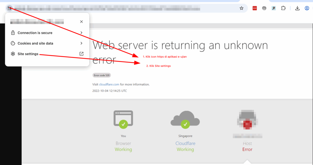 Untuk menyelesaikan masalah ini, Anda perlu membersihkan cache aplikasi e-ujian.id pada browser Anda dengan cara meng-klik icon enksripsi https pada browser dan kemudian pilih Cookies and site data seperti gambar berikut