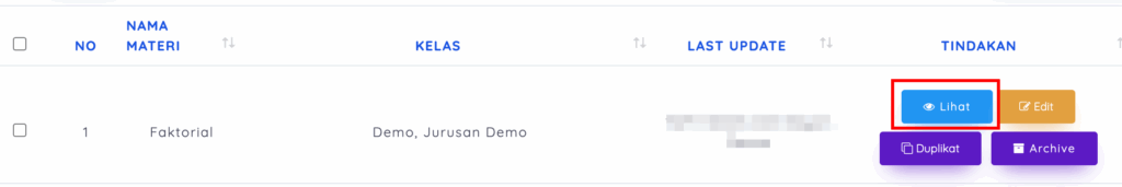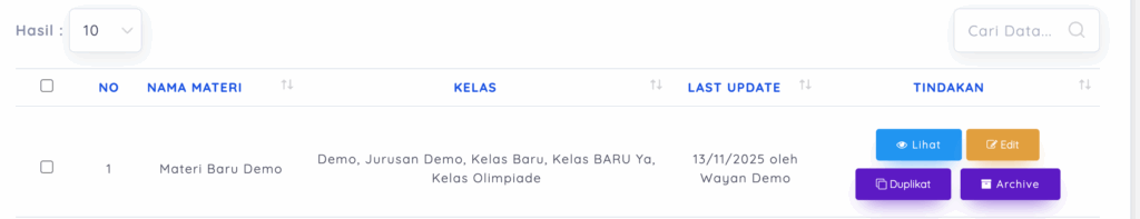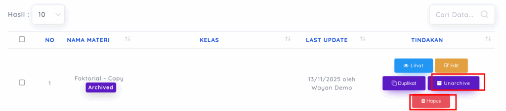 Saat status Materi dalam kondisi Archive maka Anda akan ditampilkan fitur Unarchive dan Hapus seperti berikut