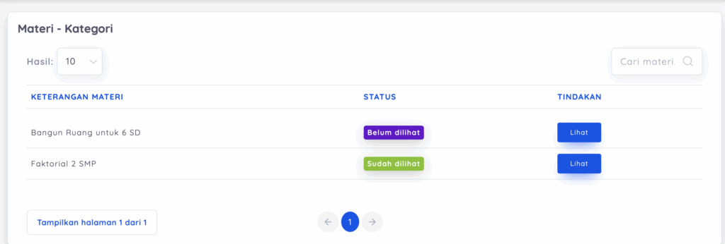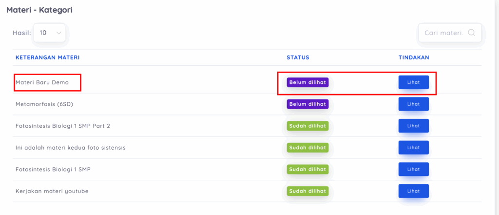 Untuk melihat materi yang telah kita buat, silakan akses Materi -> Mata Pelajaran dan kemudian pilih Lihat pada materi terkait