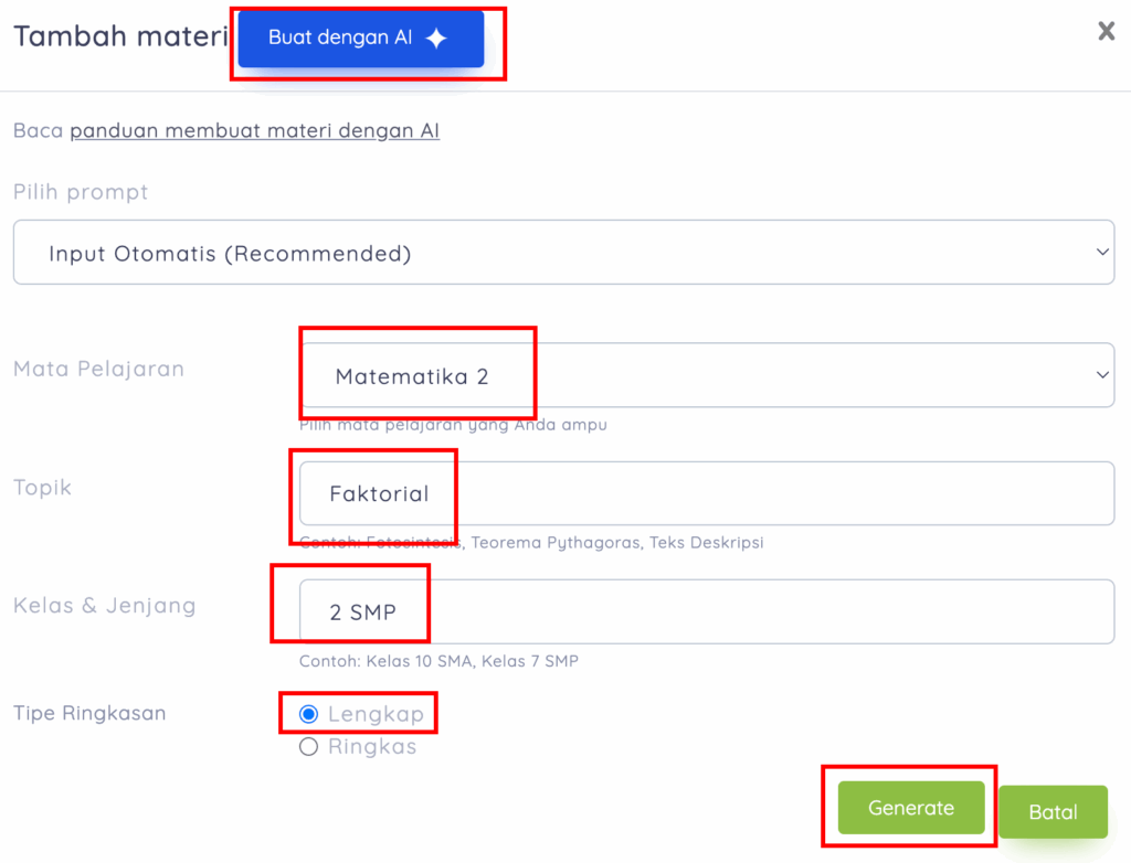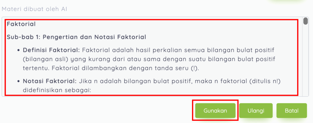 AI akan membuatkan materi untuk Anda. Silakan review hasil materi yang telah dibuat dan klik Gunakan jika telah sesuai. Anda dapat klik Ulangi untuk meminta AI membuatkan ulang jika hasilnya masih belum sesuai.