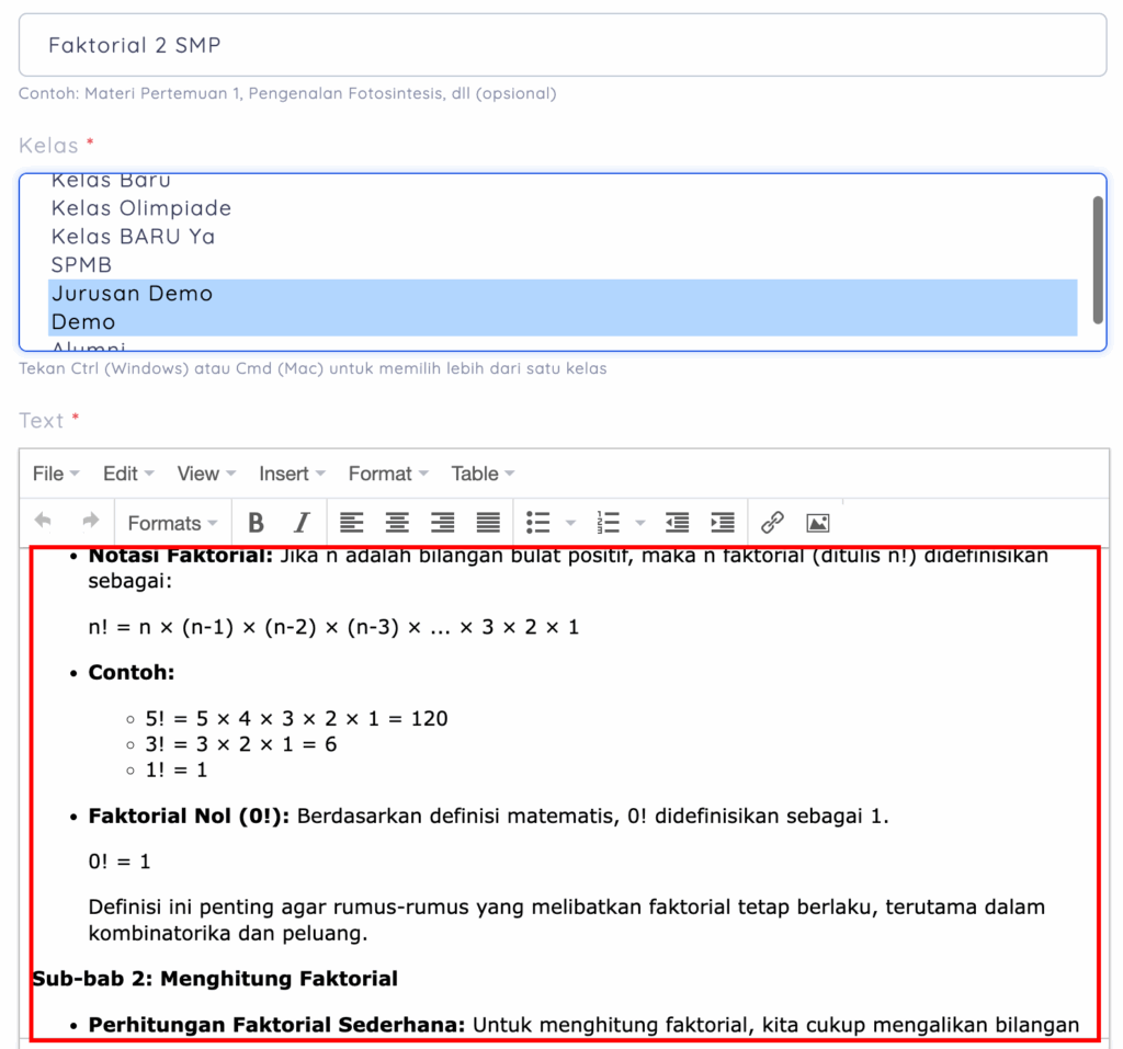 Klik Save jika sudah selesai. Selamat, materi telah berhasil dibuat dan secara otomatis akan tampil di siswa sesuai kelas yang dipilih