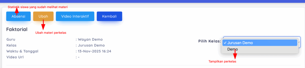 Materi akan ditampilkan. Anda dapat mengubah isi materi/kelas, melihat absensi hingga menambahkan video interaktif jika diperlukan (Lihat Cara Menambahkan Pertanyaan di Video Youtube)