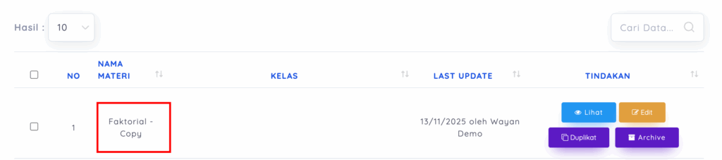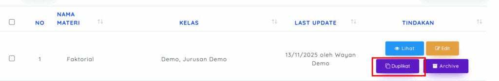 Anda dapat melakukan duplikat materi sebanyak mungkin jika diperlukan seperti hanya ingin mengubah pada materi tertentu melalui menu Duplikat seperti gambar berikut