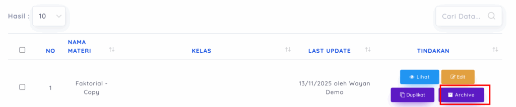 Anda dapat meng-arsipkan materi yang TIDAK ingin ditampilkan ke siswa dengan melalui menu Arsip seperti gambar berikut