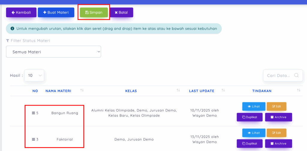 Selanjutnya, silakan tarik urutannya sesuai kebutuhan dan klik Simpan