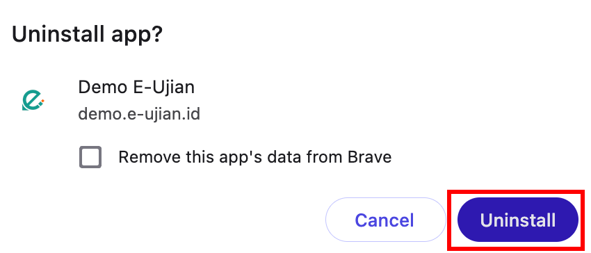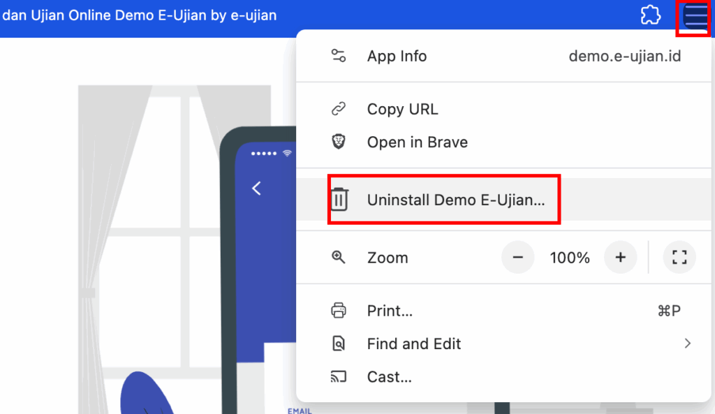 Untuk meng-uninstall, silakan buka aplikasi e-ujian yang telah diinstall sebelumnya, klik icon burger di pojok kanan atas dan klik Uninstall seperti gambar berikut